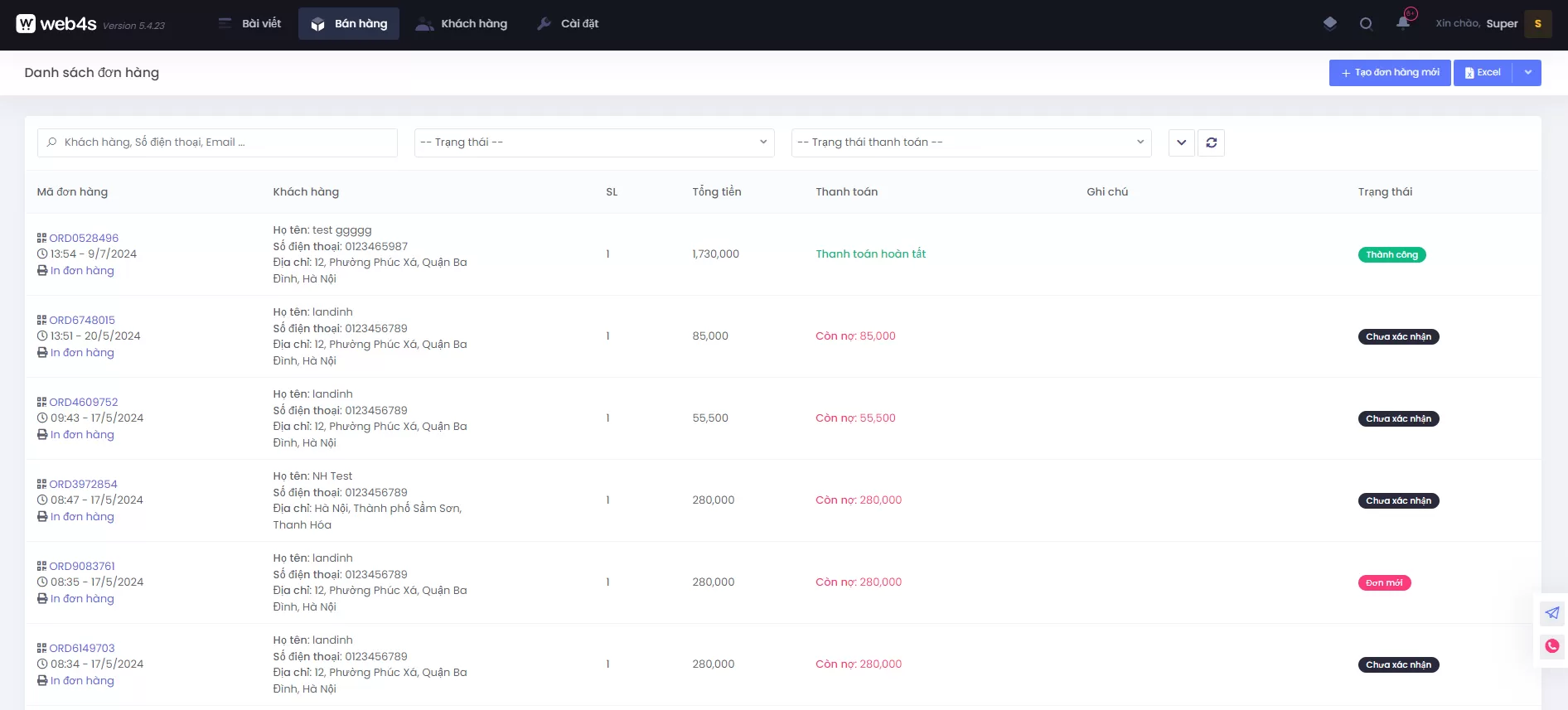 Giao diện danh sách đơn hàng trong hệ thống quản trị