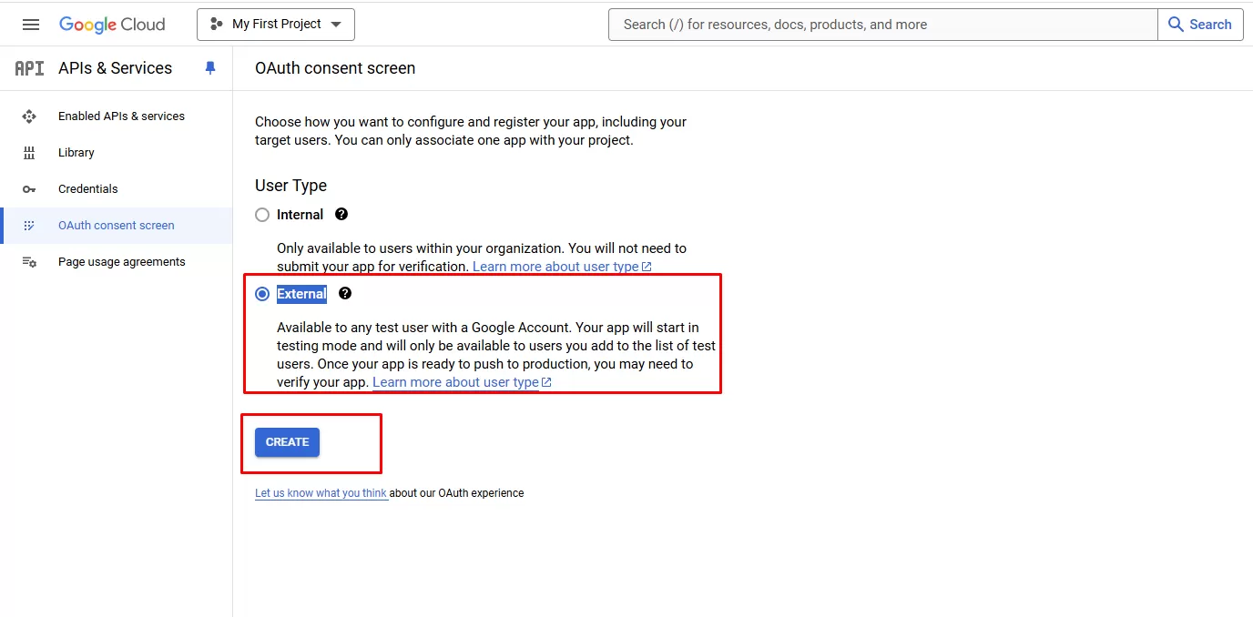 - Tại màn hình OAuth consent screen , tick chọn External và click CREATE