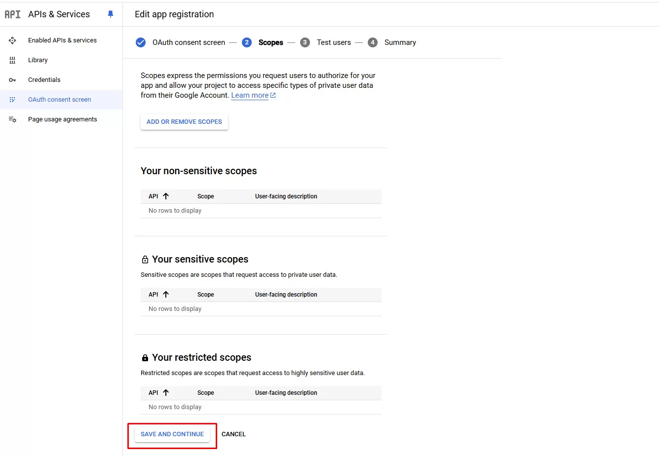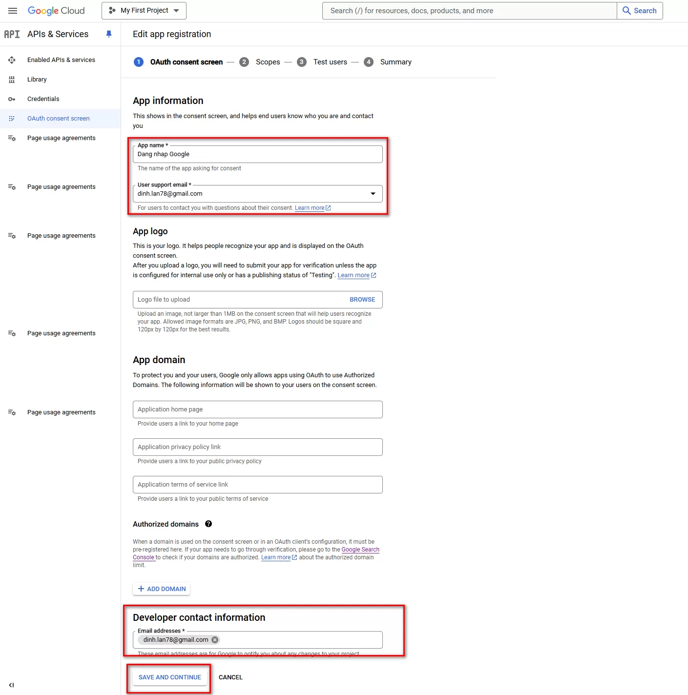 - Nhập các thông tin như App name, User support email, Email addresses, và click SAVE AND CONTINUE