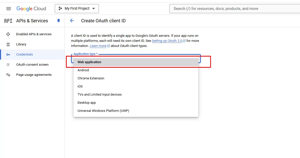 - Application type chọn Web application