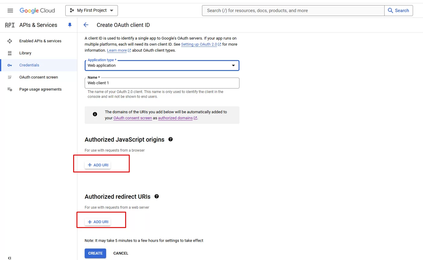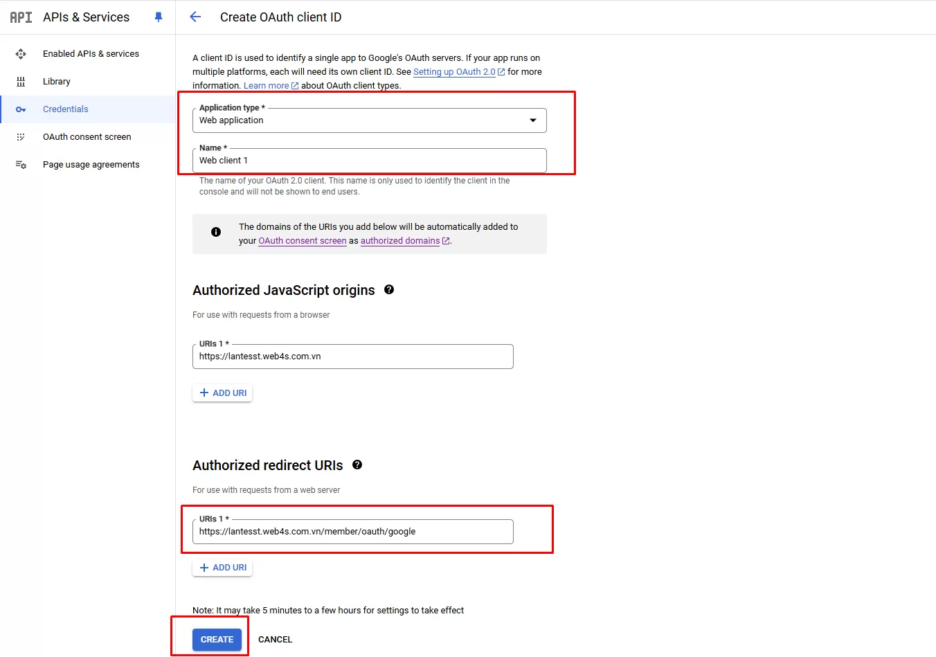 - Authorized redirect URIs : Nhập https://[Tên miền]/member/oauth/google