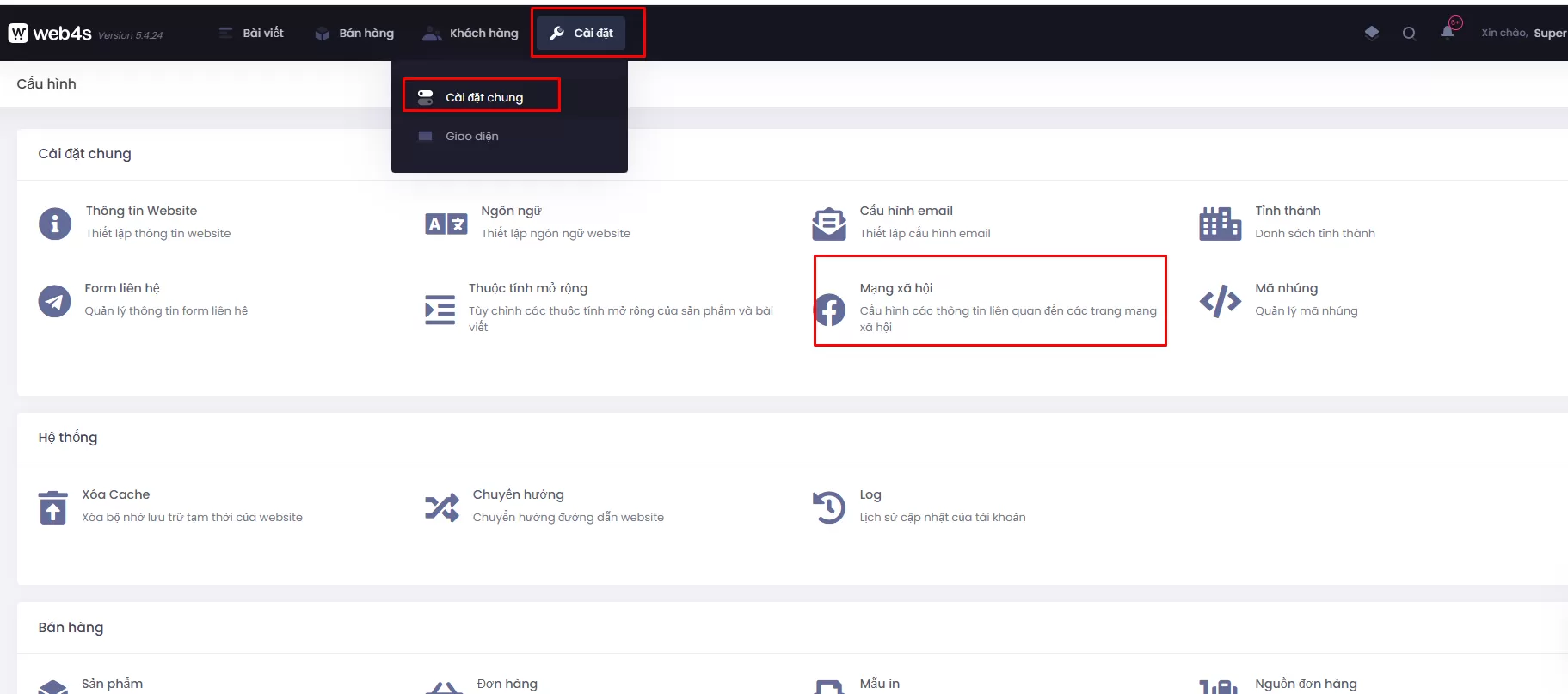 - Vào quản trị web chọn Mạng xã hội