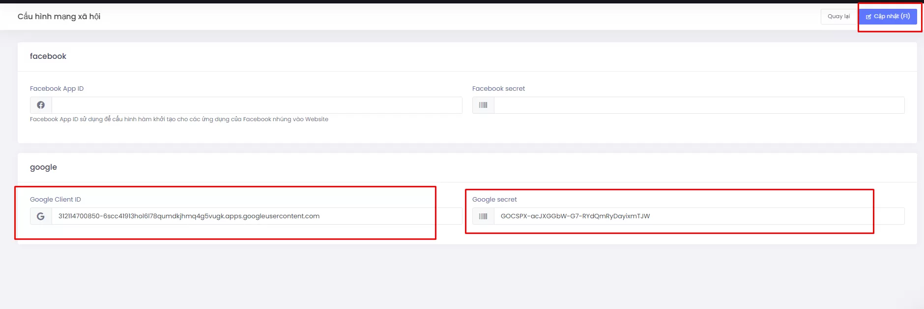 - Dán các mã vừa copy và click Cập nhật