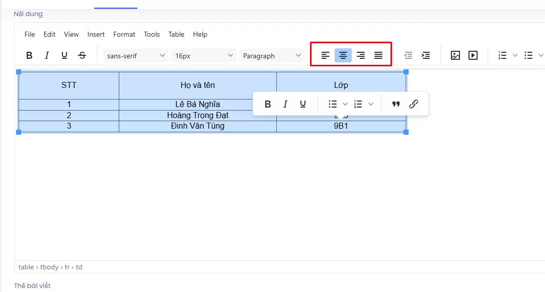 - Chọn kiểu căn chỉnh trên thanh công cụ: