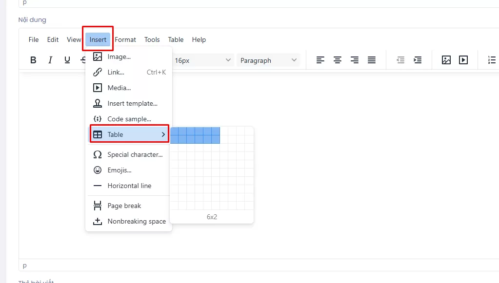 - Chọn Insert → Table trên thanh công cụ.