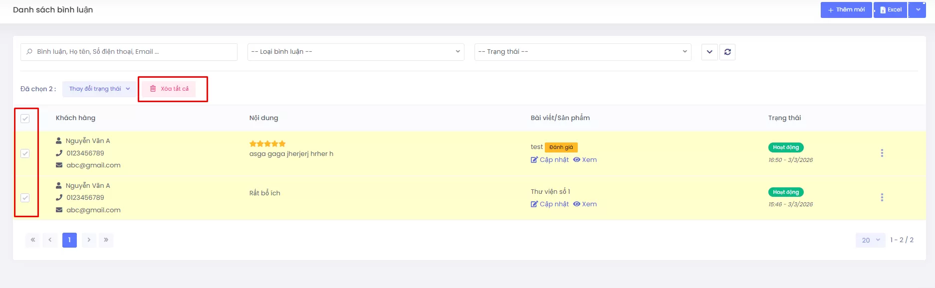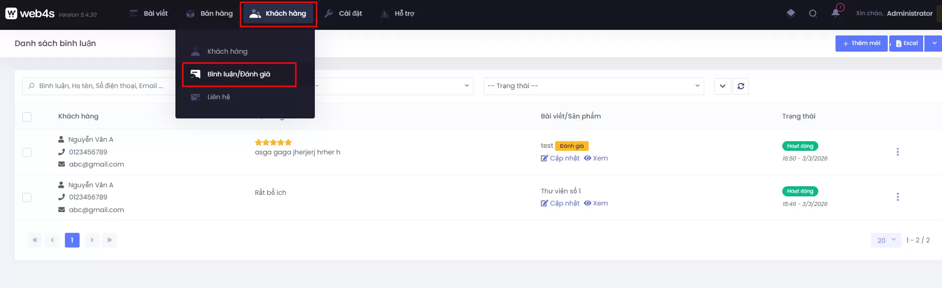 Tại giao diện quản trị website, di chuyển chuột vào menu Khách hàng → chọn Bình luận / Đánh giá.