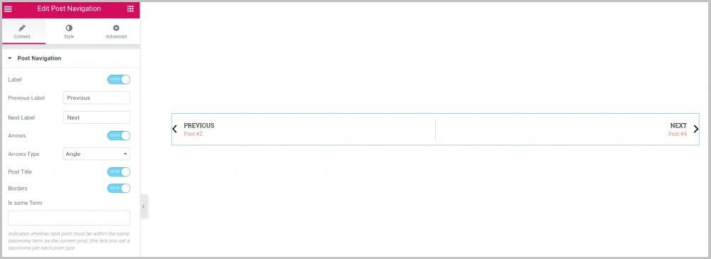 - Trong Elementor, bạn tìm tiện ích Post Navigation. Ở đây có Tab Nội dung, Style và Advanced.