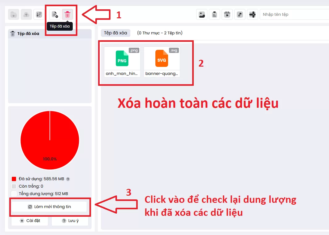 Kiểm tra thùng rác trong media, Xóa các tập tin hoàn toàn khỏi website và check lại để xem dung lượng thực tế khi xóa