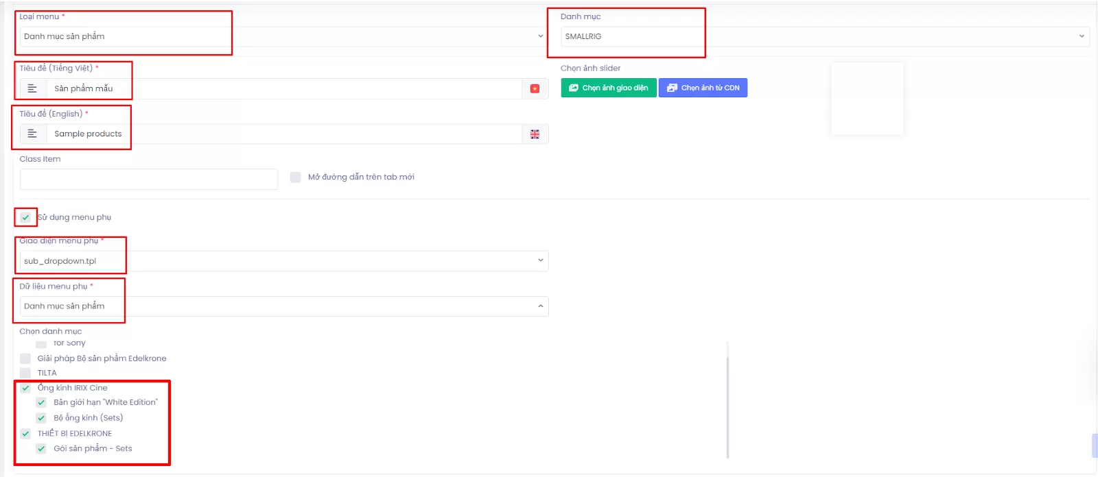 5.2. Các cấu hình giao diện menu phụ và submenu (Dữ liệu menu phụ) là danh mục sản phẩm hoặc bài viết.