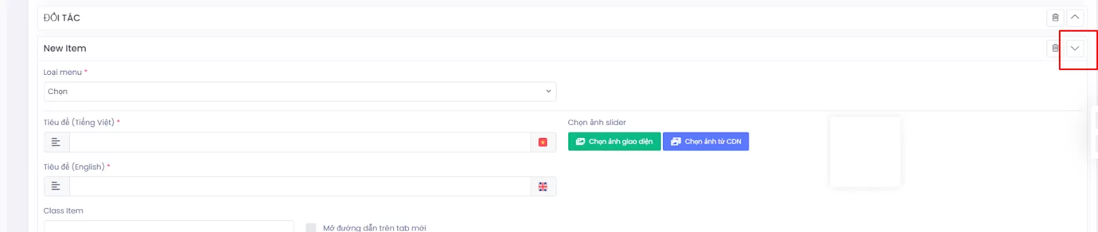 Bước 2: Một menu mới tên New Item xuất hiện. Click mũi tên (^) ở cuối menu để mở chỉnh sửa.