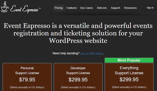 Event Espresso 4 Decaf là phiên bản Plugin mới nhất mang đến một số tính năng vượt trội hơn so với Event Espresso 3. Bạn có thể lựa chọn giữa bản miễn phí và bản có phí với các tính năng hữu ích và nổi bật hơn. Bản tính phí có giá bắt đầu từ 79,95$. Gói với đầy đủ tất cả các tính năng là 299,95$.